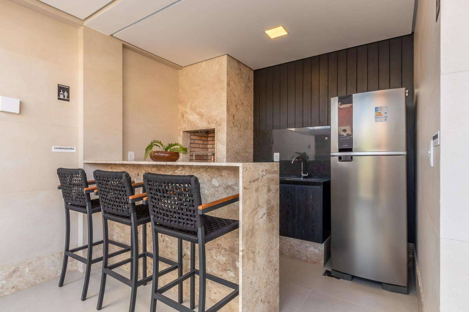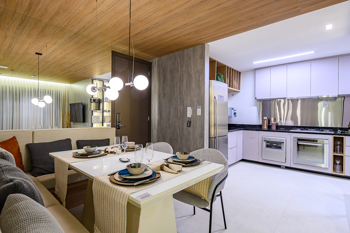 A cozinha americana é um convite à convivência e ao prazer de cozinhar, integrando-se harmoniosamente à sala ampla;