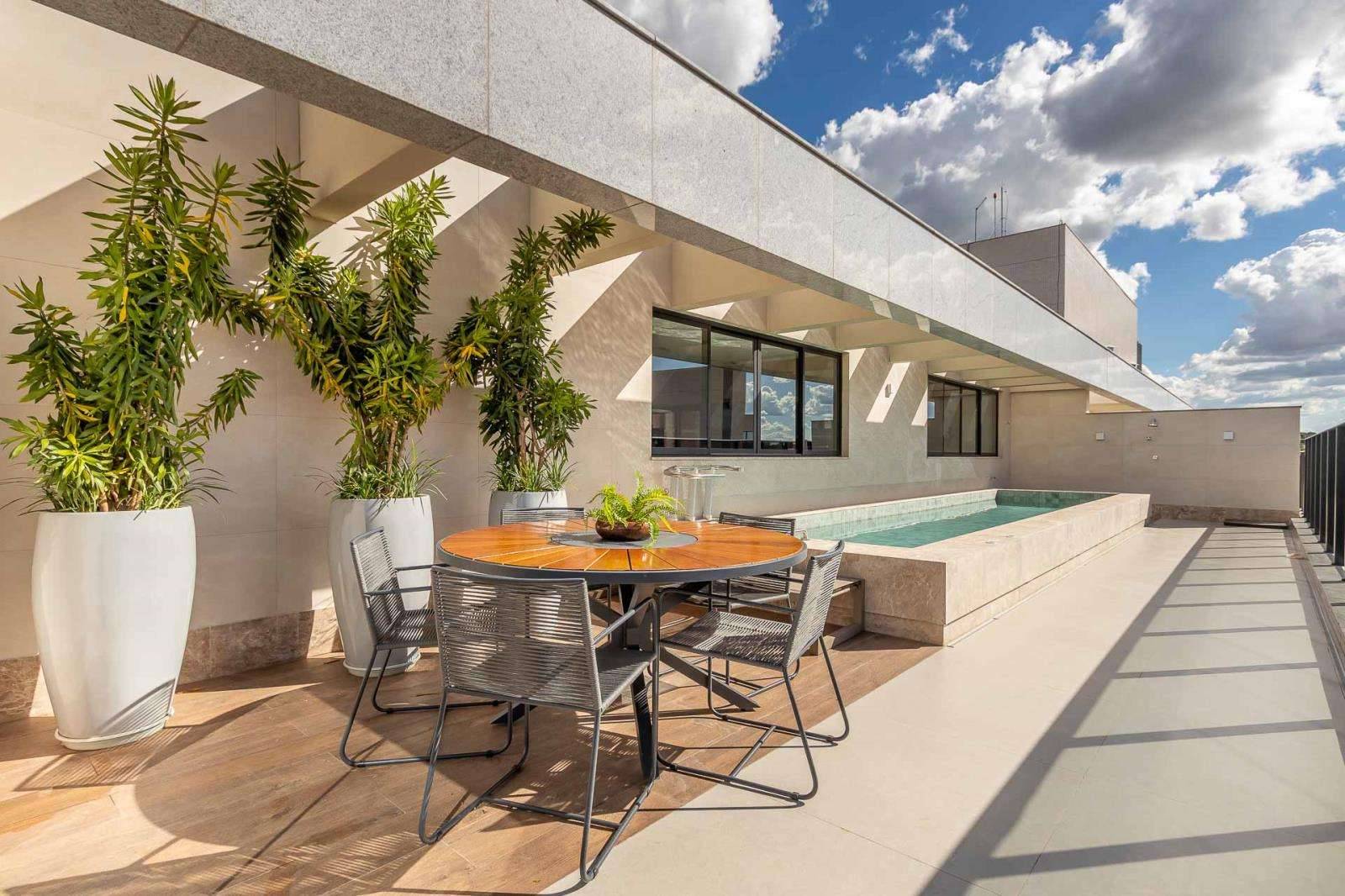 A varanda se estende como um refúgio urbano, perfeita para desfrutar de momentos de tranquilidade ou entretenimento;